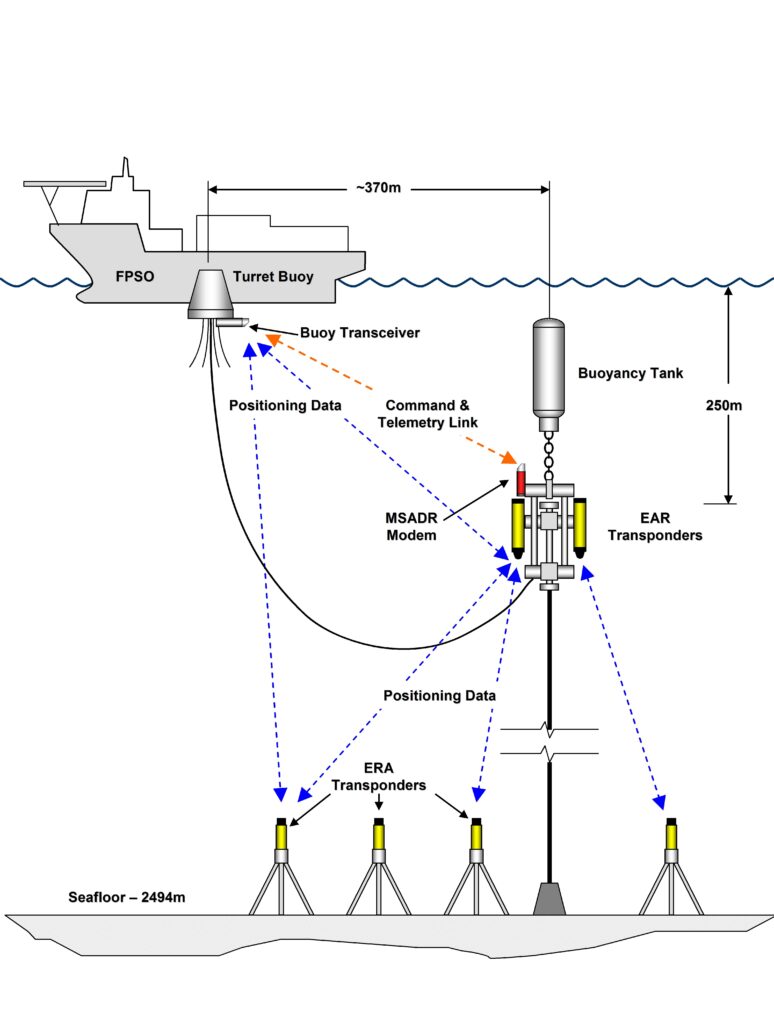 The primary requirement for the acoustic instrumentation is to monitor the position of each riser tower and of the turret buoy relative to the seabed. In addition, integrated sensors monitor depth, temperature, inclination and sound speed whilst the integrated modem transfers data from the load and attitude monitoring system on each riser tower to the turret buoy. The system uses Sonardyne Wideband acoustic telemetry to guarantee high speed and reliable data communications for all these tasks.