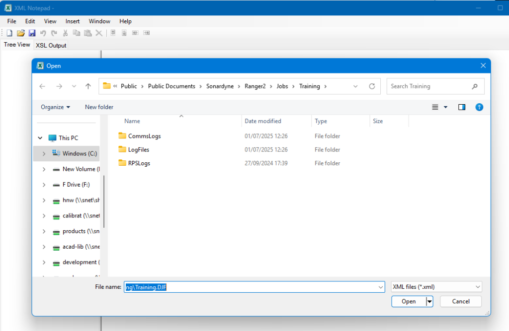 You can also change the xsl file location, from the XSL Output tab, however you need to select the XSL file found at “C:\Users\Public\Documents\Sonardyne\Ranger2\Jobs\denovo.xsl”, and not the DJF as you’ve tried to do in your screenshot.