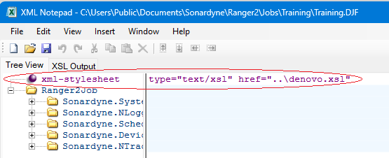 type=”text/xsl” href=”C:\Users\Public\Documents\Sonardyne\Ranger2\Jobs\denovo.xsl”